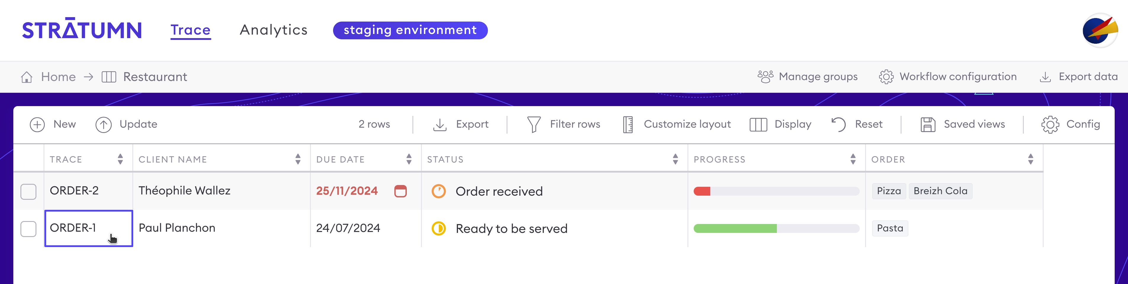 The worfklow overview is a table that displays informations about the workflow’s traces.Each row represents a trace and its columns are composed of widgets.