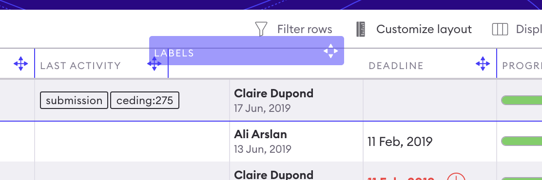 Reorder columns by dragging headers. Adjust width by resizing headers. Changing row height updatesrowsHeight.